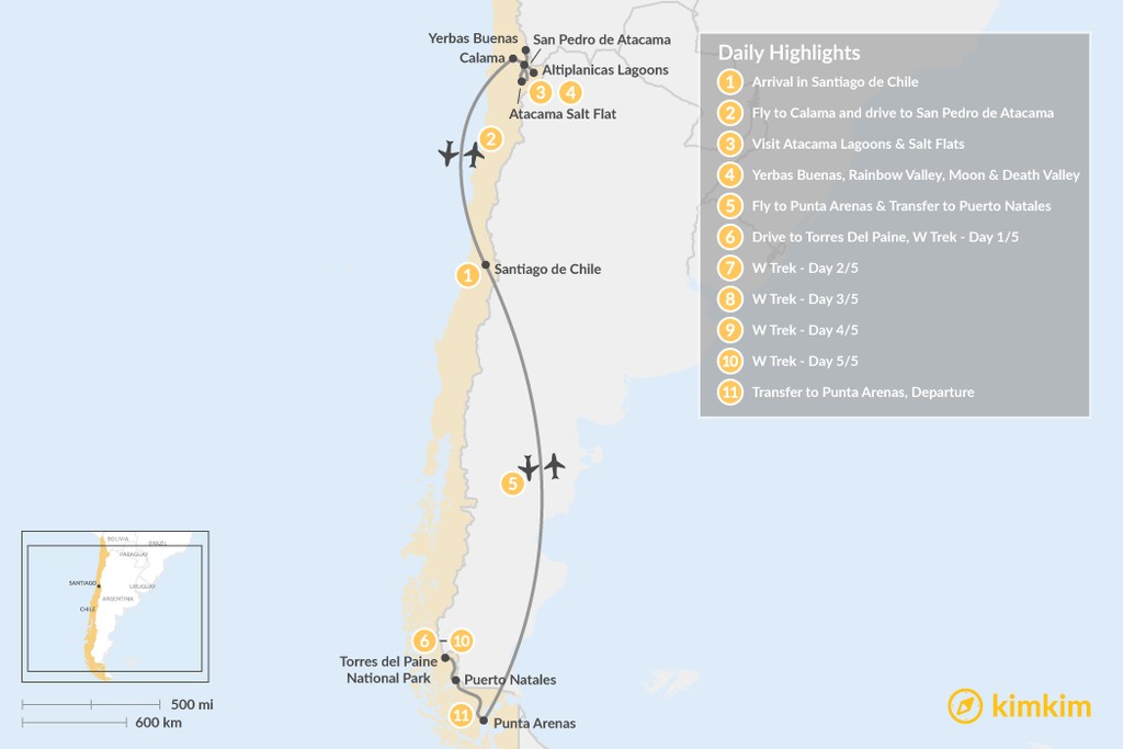 Map of Atacama Desert & W Trek Excursion – 11 Days