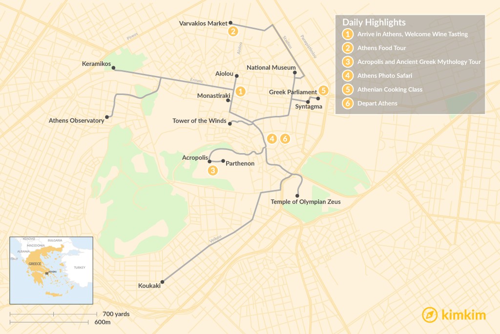 In the evening, you’ll sit down to drink to your upcoming adventure with a wine tasting in a bar in downtown Athens.