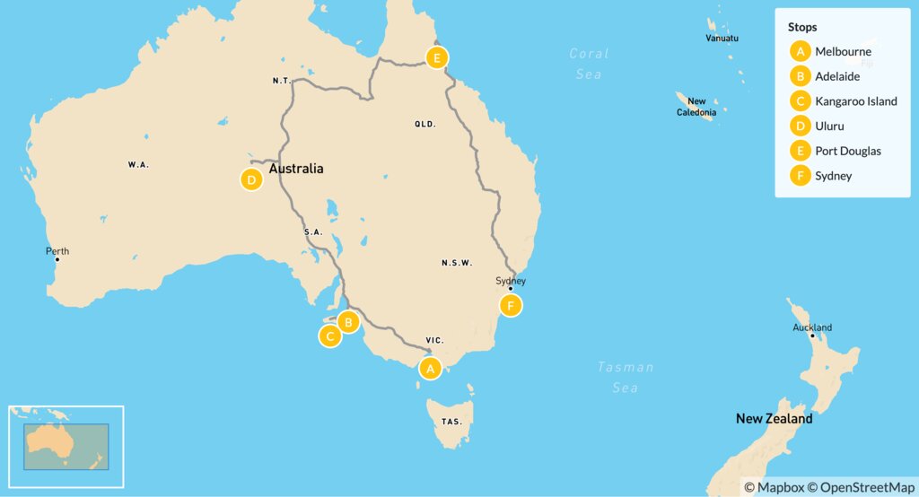 Map of Australia City, Outback, Rainforest & Reef Tour – 18 Days