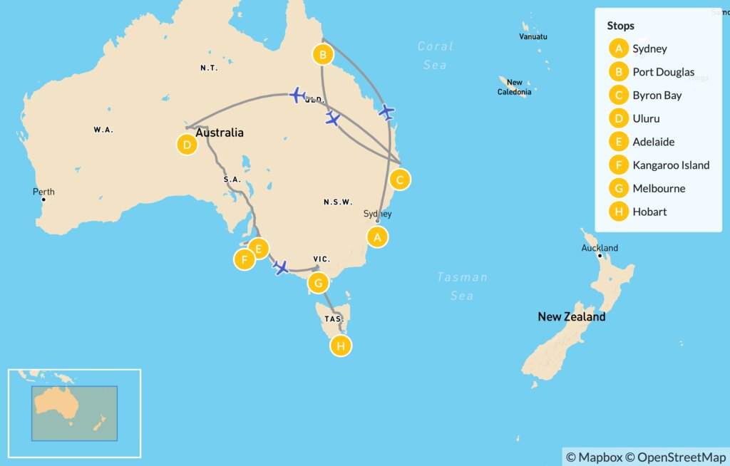 Map of Australia Grand Tour: Sydney to Tasmania – 21 Days
