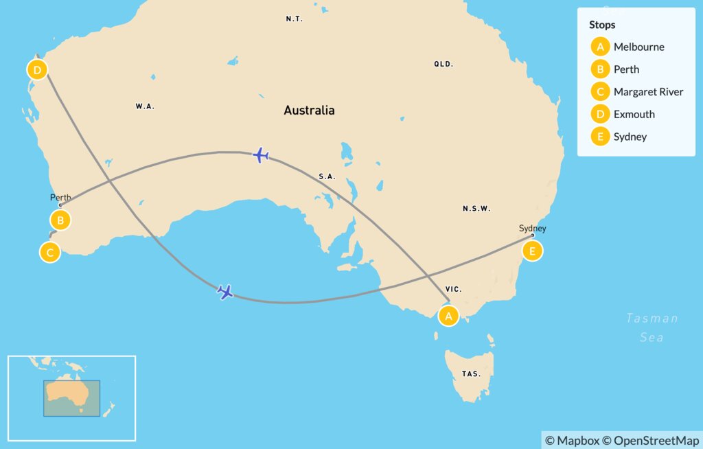Map of Australia Honeymoon Outdoor Adventure: Melbourne, Sydney & the West Coast – 14 Days