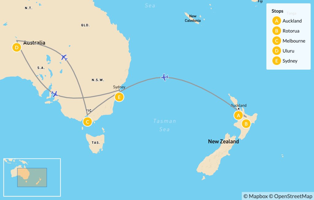 Map of Australia & New Zealand Culture Tour: Auckland, Rotorua, Melbourne, Uluru & Sydney – 10 Days
