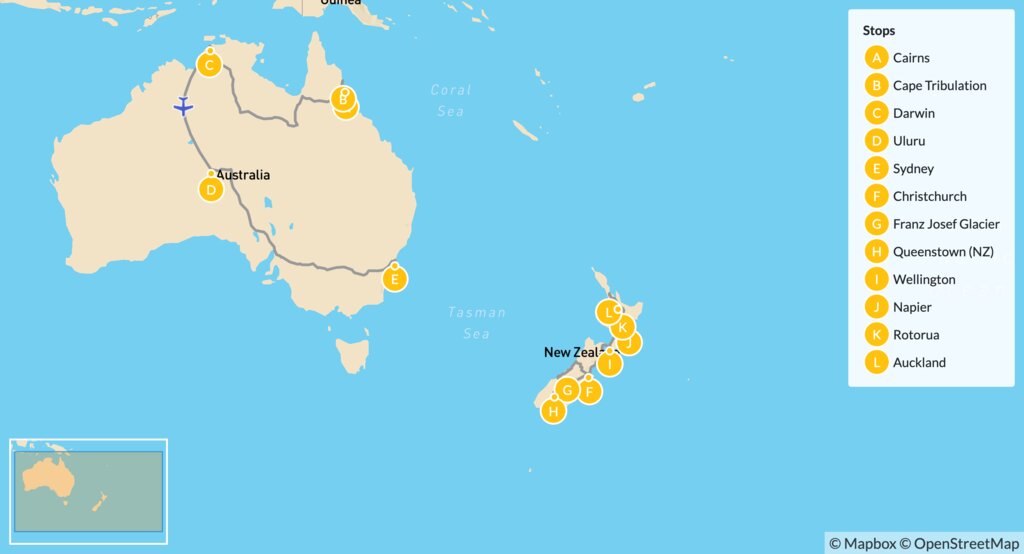 Map of Australia & New Zealand Natural Wonders Road Trip – 21 Days