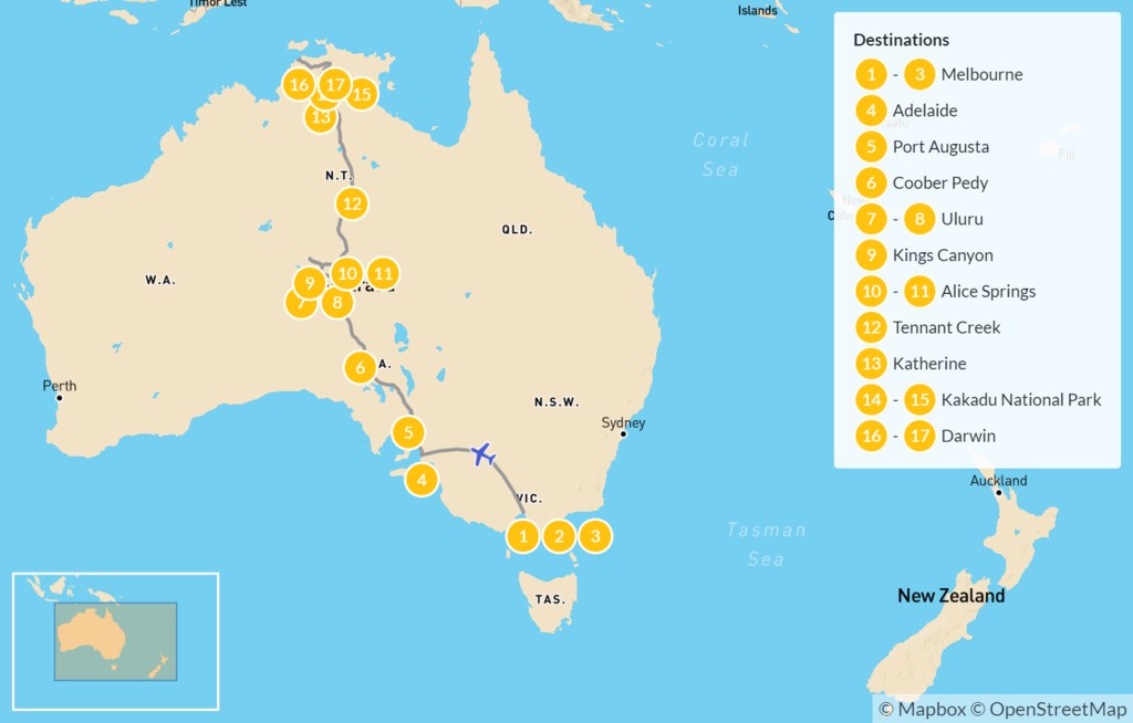 Map of Australian Outback Self-Drive Tour- 18 Days