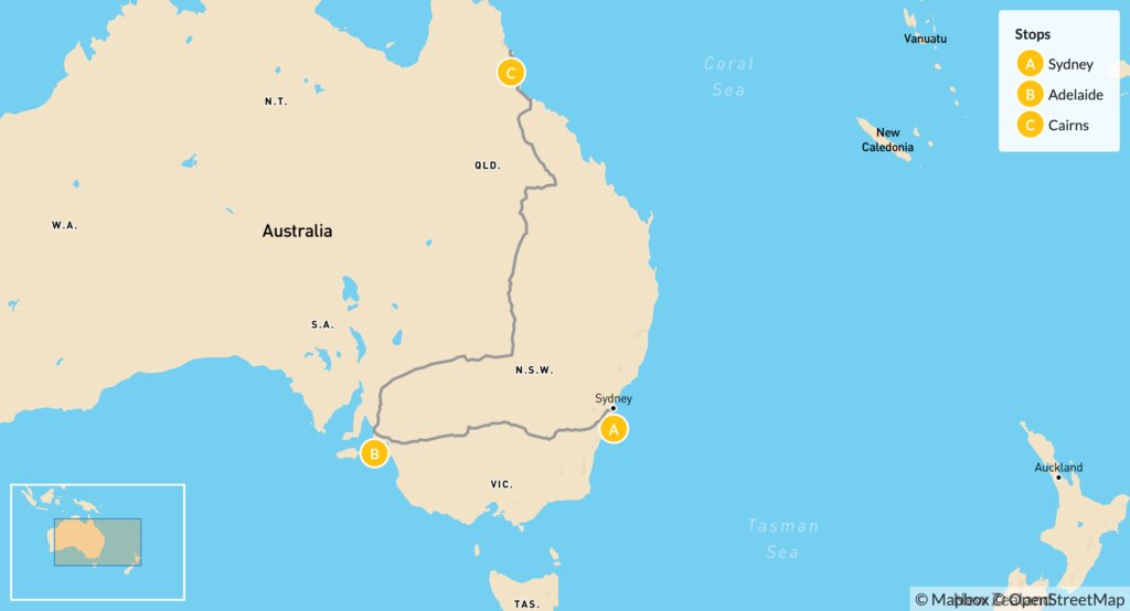 Map of Australia’s Food, Wine & Wildlife: Sydney, Adelaide & Cairns – 11 Days