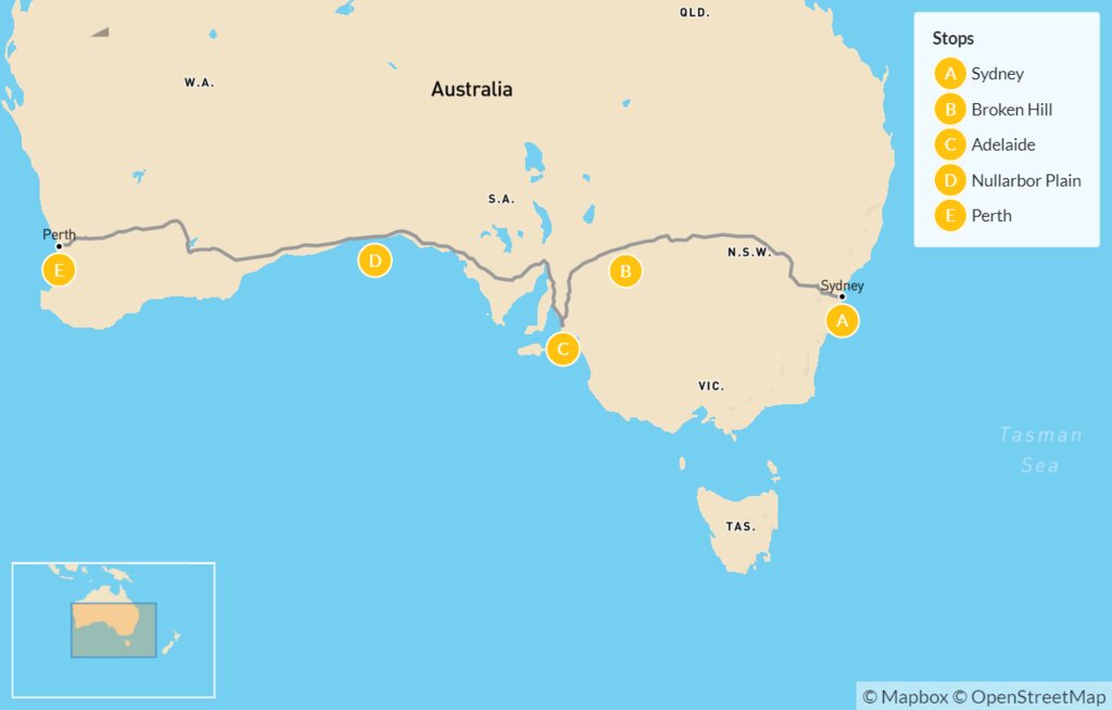 Map of Australia’s Indian Pacific Rail Journey: Sydney, Adelaide, Nullarbor Plain & Perth – 8 Days