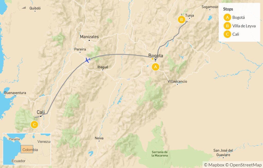 Map of Authentic Luxury in Colombia’s Interior: Bogotá, Villa de Leyva & Cali – 7 Days