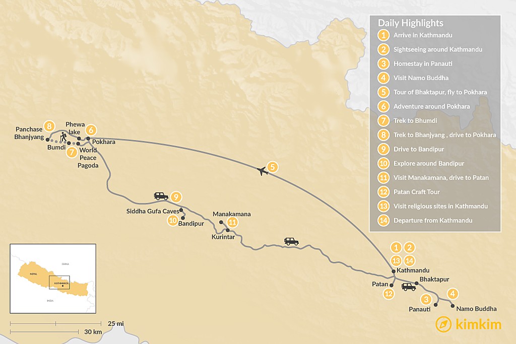 After arriving in the village of Panchase Bhanjyang, a car will take you back to Pokhara.