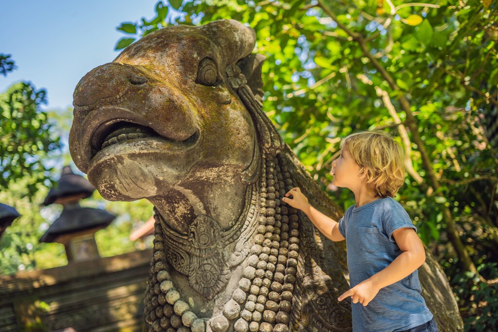 Next, continue on to a number of beautiful local temples. These will be interesting places for the kids as there are always many statues of Hindu deities and animals, as well as flowers, ponds, and other engaging features. Start with a visit to Goa Gajah, which translates to the “Elephant Cave.” This religious sanctuary is a UNESCO World Heritage Site and reflects a blend of Hindu and Buddhist cultures. If little kids are a bit worried by the intimidating Boma statue at the entrance, reassure them that it’s there to scare away evil spirits, not friendly visitors like them!
