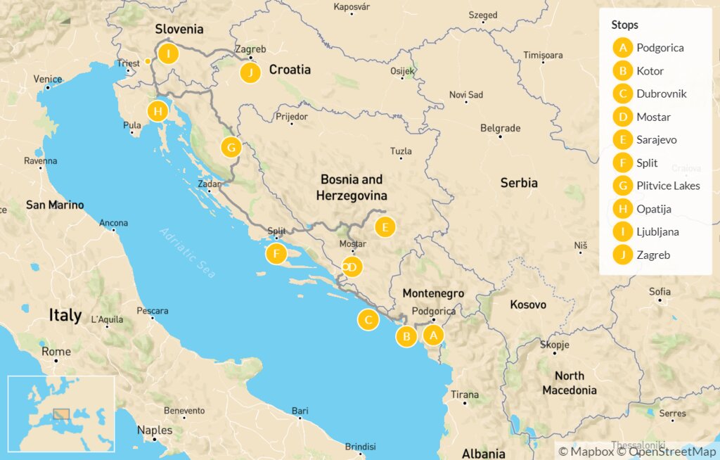 Map of Balkan Capitals & Culture: Podgorica, Sarajevo, Ljubljana & Zagreb – 21 Days T2036