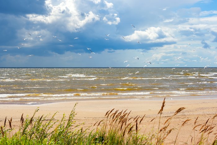 Your destination today is the spectacular coastal resort town of Jūrmala. Located about 24 miles (40 km) west of the capital, this popular holiday destination on the Gulf of Riga is famous for its elegant wooden homes done in the Art Nouveau style as well as its long, white-sand beach.