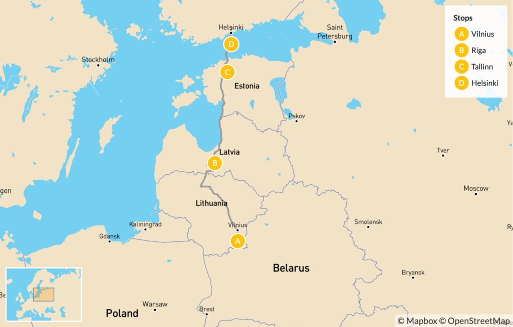 Map of Baltic Capitals: Vilnius, Riga, Tallinn & Helsinki – 10 Days