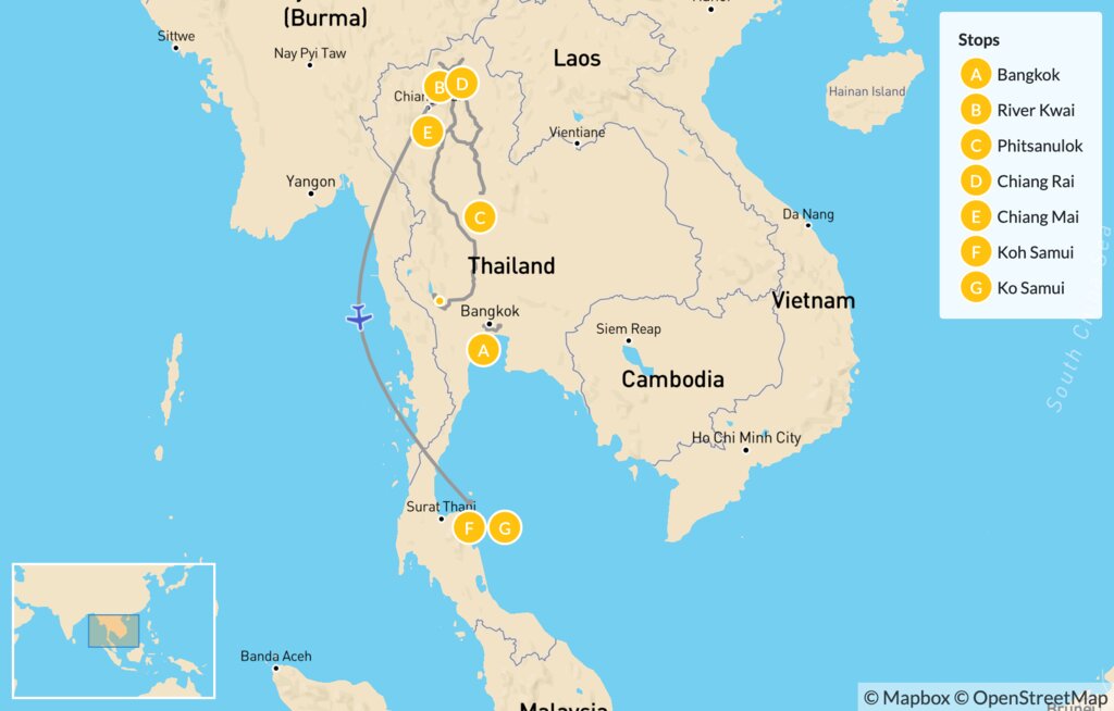 Map of Bangkok, Northern Thailand & Ko Samui – 14 Days