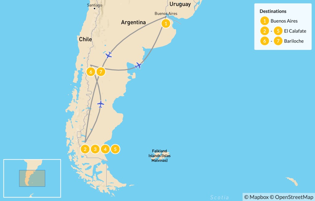 Map of Bariloche & El Calafate Classic Tour – 8 Days