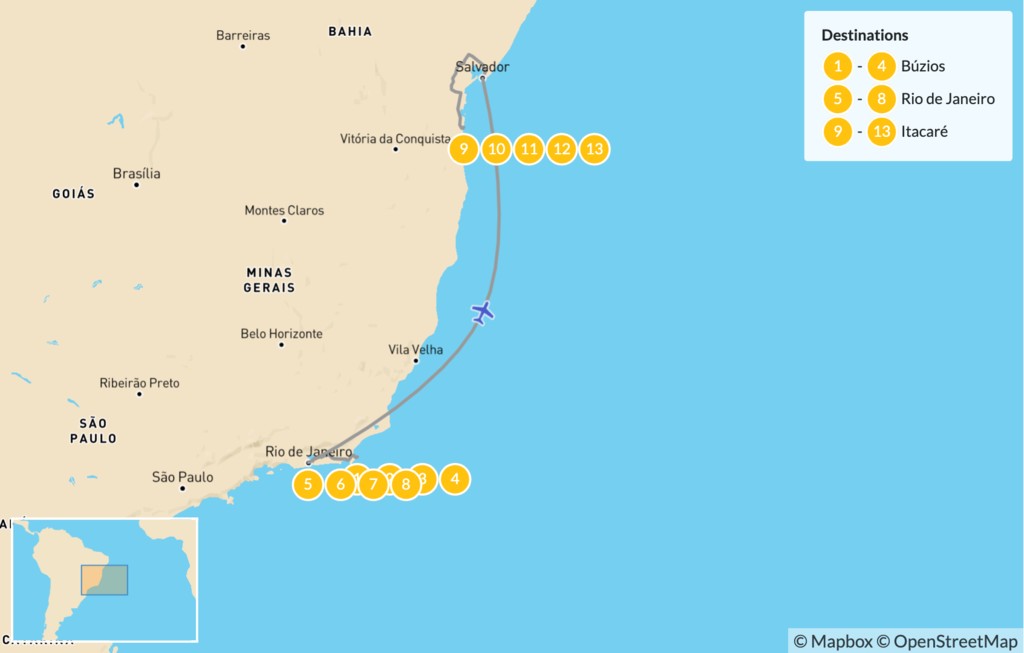 Map of Beach Honeymoon in Brazil: Búzios, Rio de Janeiro & Itacaré – 14 Days