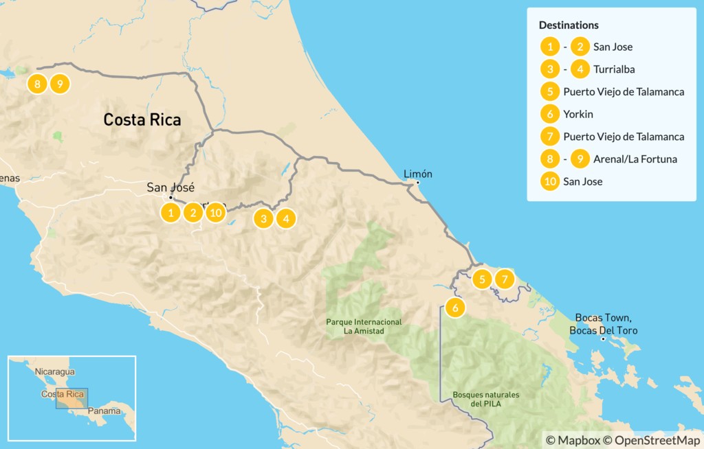 Map of Beaches, Rainforests & Cultural Exchange in Costa Rica – 11 Days