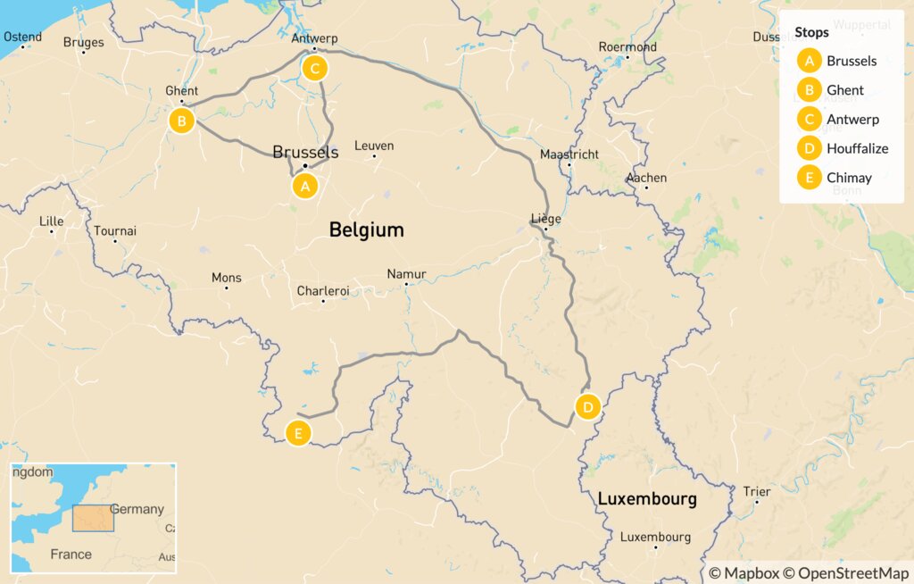 Map of Belgian Beer Tour: Ghent, Antwerp, Houffalize, Chimay & Brussels – 10 Days