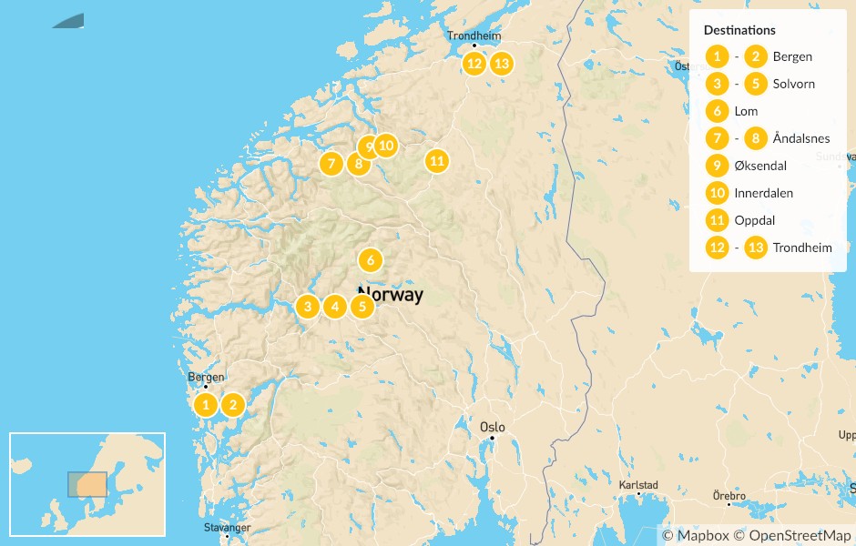 Map of Bergen to Trondheim Outdoor Adventure -14 Days