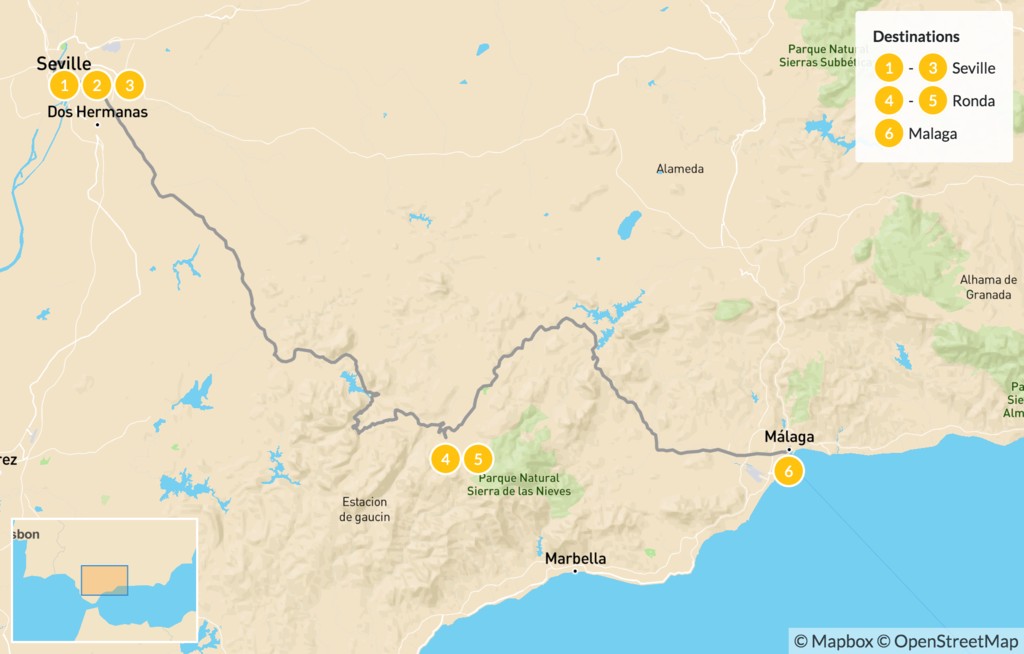 Map of Best of Andalusia: Seville, Ronda & Málaga – 7 Days