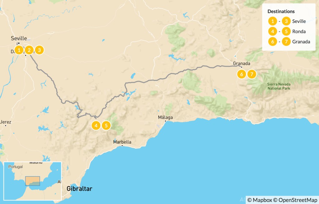 Map of Best of Andalusia’s Interior: Seville, Ronda, & Granada – 8 Days