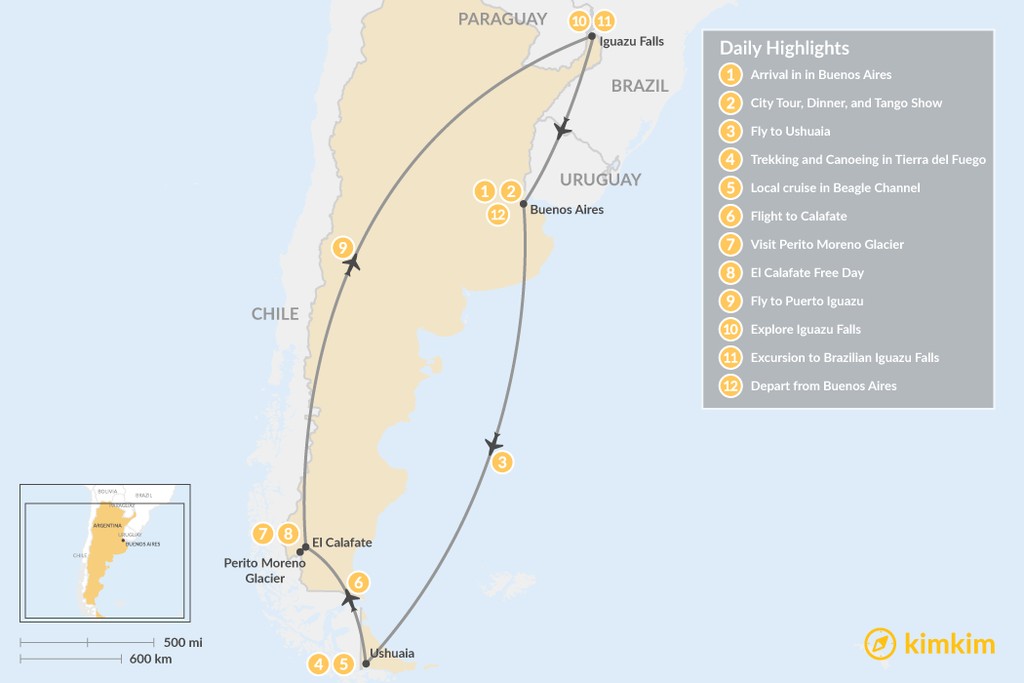 Map of Best of Argentina: Ushuaia, El Calafate & Iguazú Falls – 12 Days