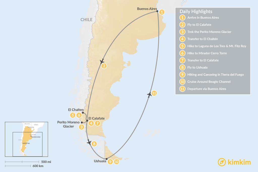 Map of Best of Argentine Patagonia: Buenos Aires, El Calafate, El Chaltén & Tierra del Fuego – 11 Days