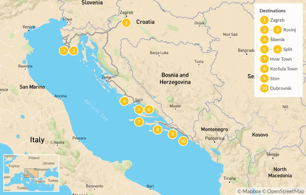 Map of Best of Croatia: Zagreb, Rovinj, Šibenik, Hvar, & Dubrovnik – 11 Days