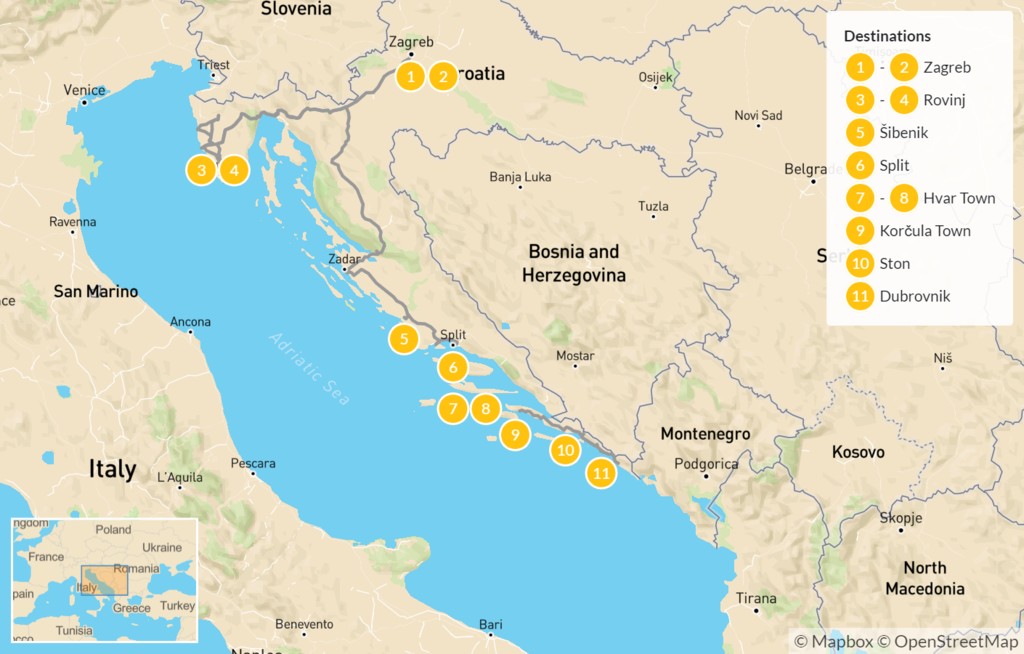 Map of Best of Croatia: Zagreb, Rovinj, Šibenik, Hvar, & Dubrovnik – 12 Days