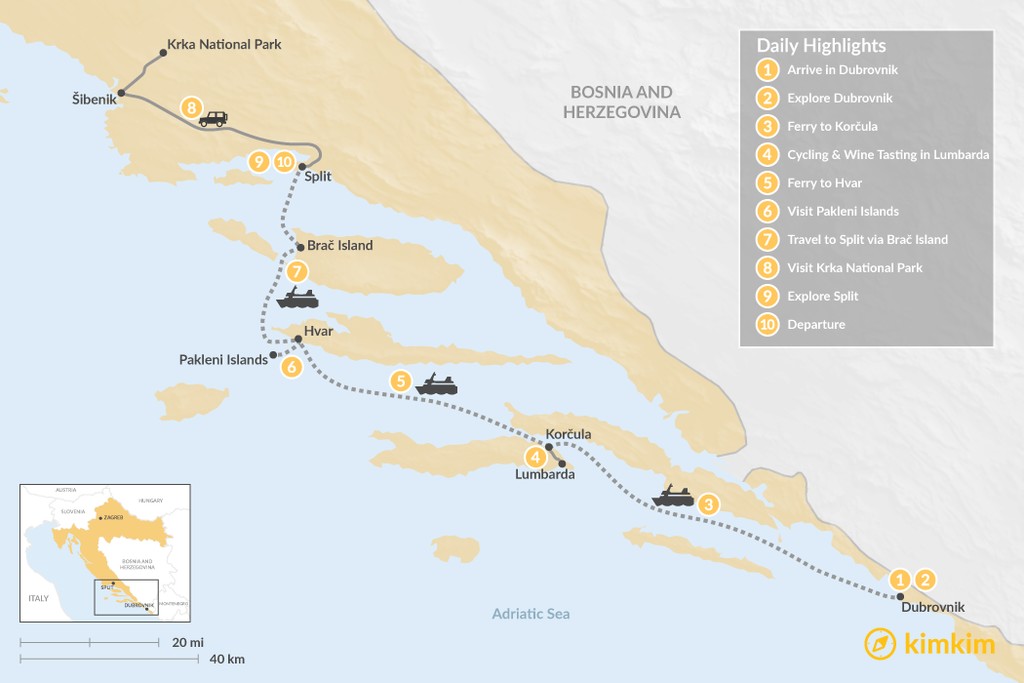 Map of Best of Dalmatia: Dubrovnik, Korčula, Hvar & Split – 10 Days