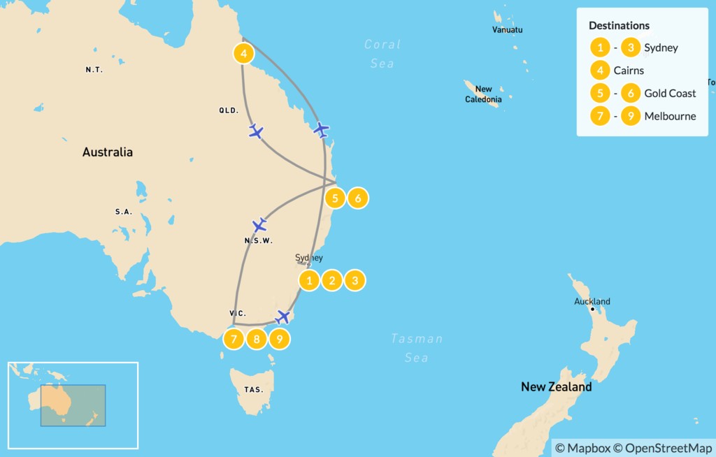Map of Best of Eastern Australia: Sydney, Cairns, Gold Coast & Melbourne – 10 Days