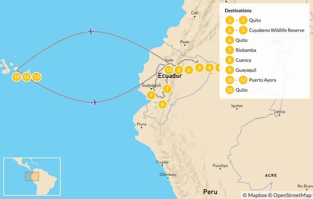| Day 13 | Transfer to Airport on Baltra Island & Fly to Quito | Quito |