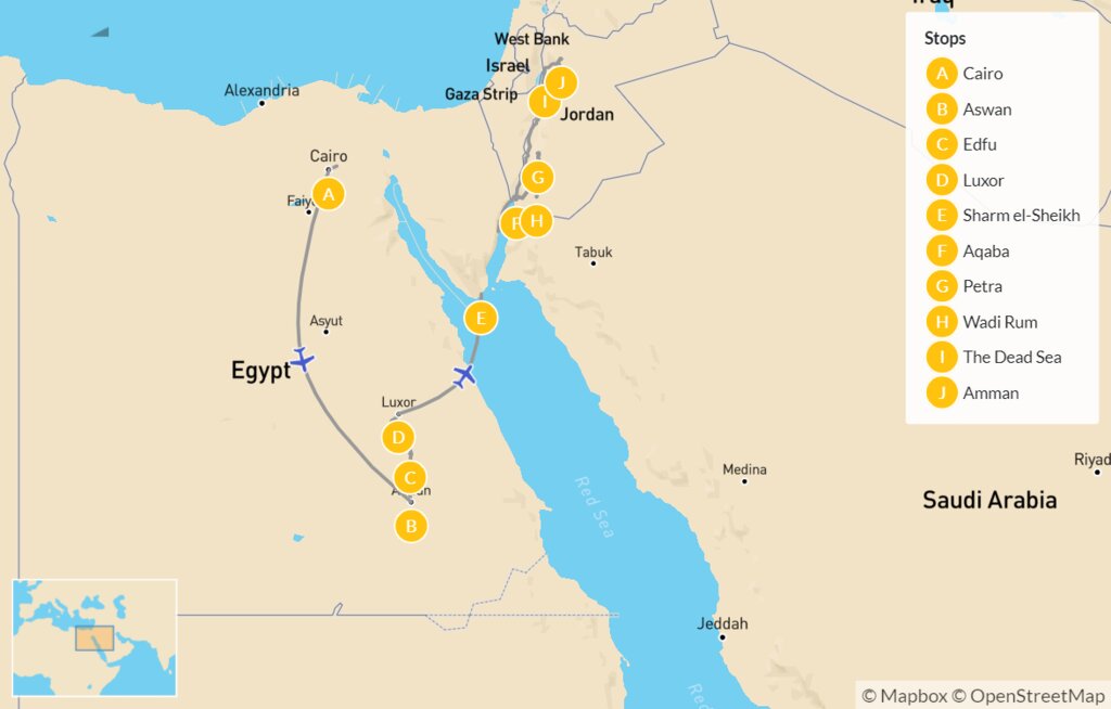 Map of Best of Egypt & Jordan: From the Pyramids to Petra – 14 Days
