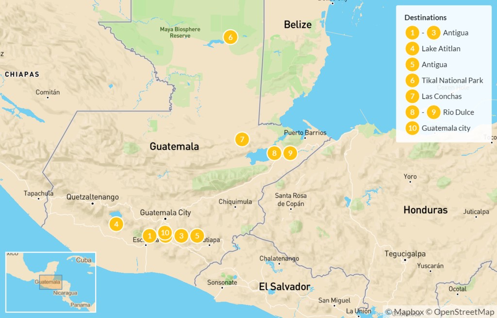 Discover the best of Guatemala over 11 action-packed days during which you’ll climb volcanoes, visit Maya villages, and soak in natural hot springs. Hike, bike, and kayak around the country as you explore the colonial city of Antigua, enjoy the serene beauty of Lake Atitlán, and tour the ancient pyramids at Tikal. For an added treat, take a ride up the Río Dulce for an afternoon on the Caribbean coast.