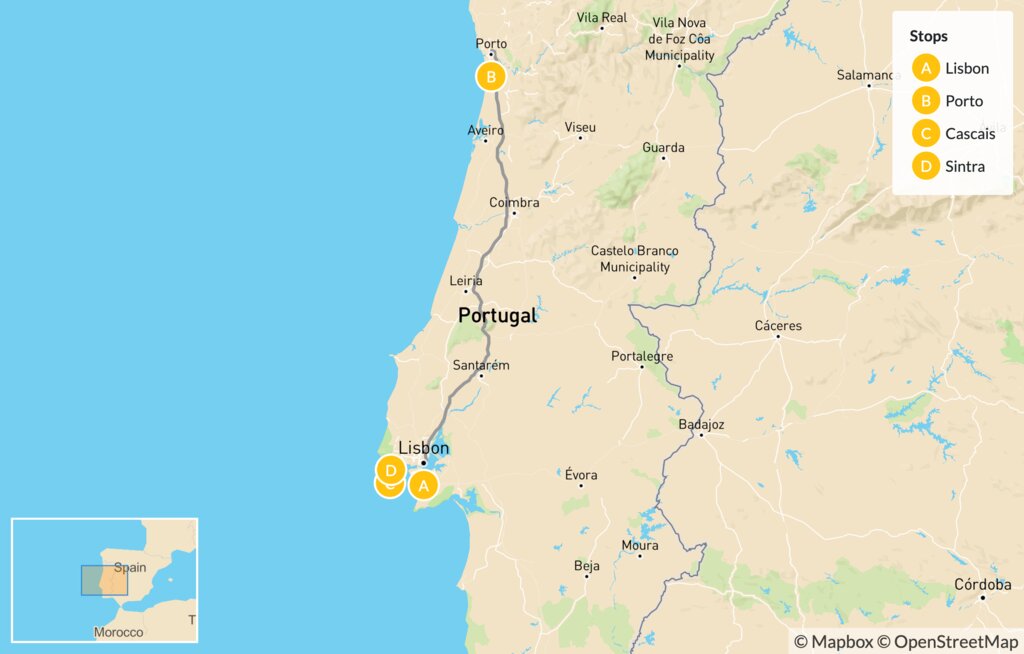 Map of Best of Lisbon & Porto: Lisbon, Porto, Cascais & Sintra – 8 Days