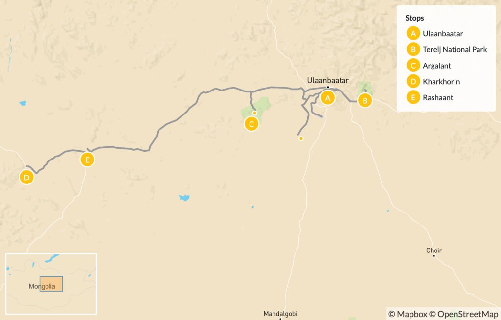 Map of Best of Mongolia’s Natural Landscapes & Rich Culture – 7 Days