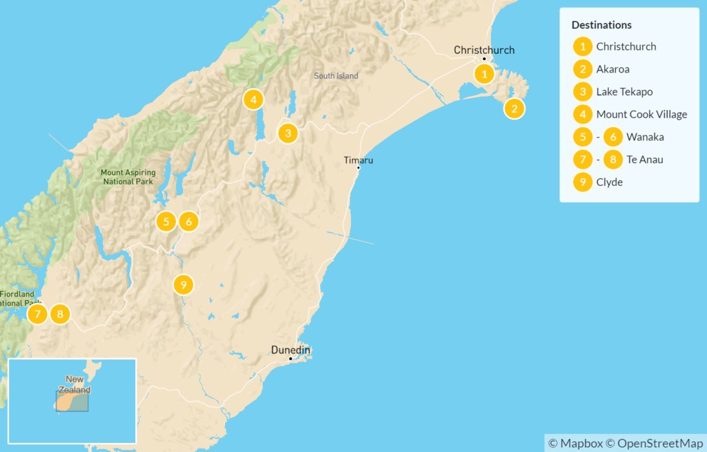 This 10-day road trip in the South Island combines the best New Zealand has to offer. Discover jaw-dropping scenery here, including Lake Tekapo and its turquoise waters, Mt. Cook and the surrounding glaciers, the peaks of Mt. Aspiring National Park and the magnificent fjords. You will also enjoy more intimate and off-the-beaten-path experiences, including the exploration of the Banks Peninsula, with its active wildlife setting, as well as immersing yourself in the historical gold rush of the small town of Clyde.