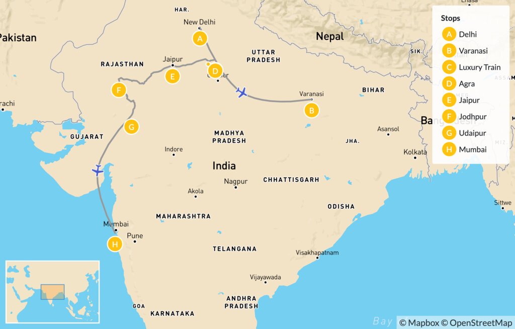 Map of Best of North India: Golden Triangle, Varanasi, Rajasthan & Mumbai – 15 Days
