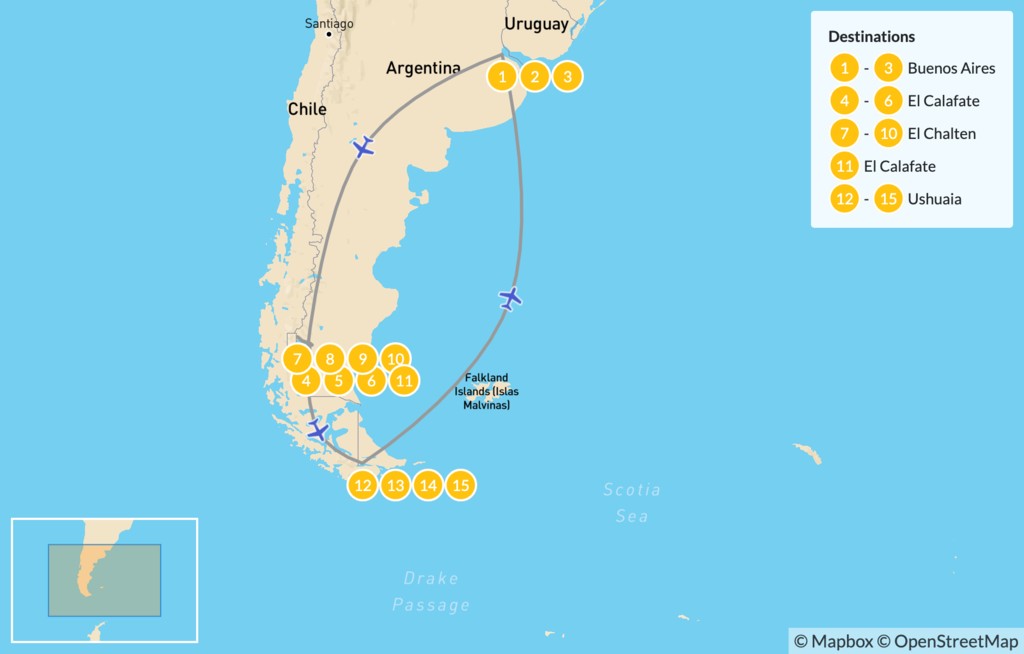 Map of Best of Patagonia: Buenos Aires, El Calafate, & Ushuaia – 16 Days