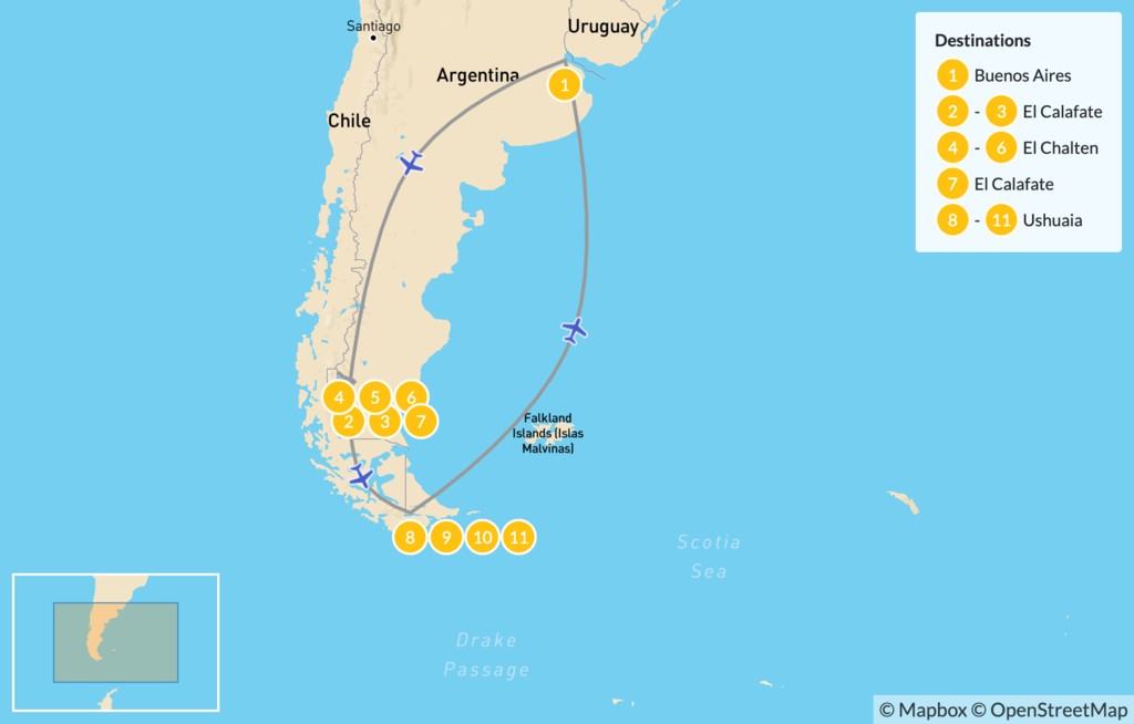 Map of Best of Patagonia: El Calafate & Ushuaia – 12 Days