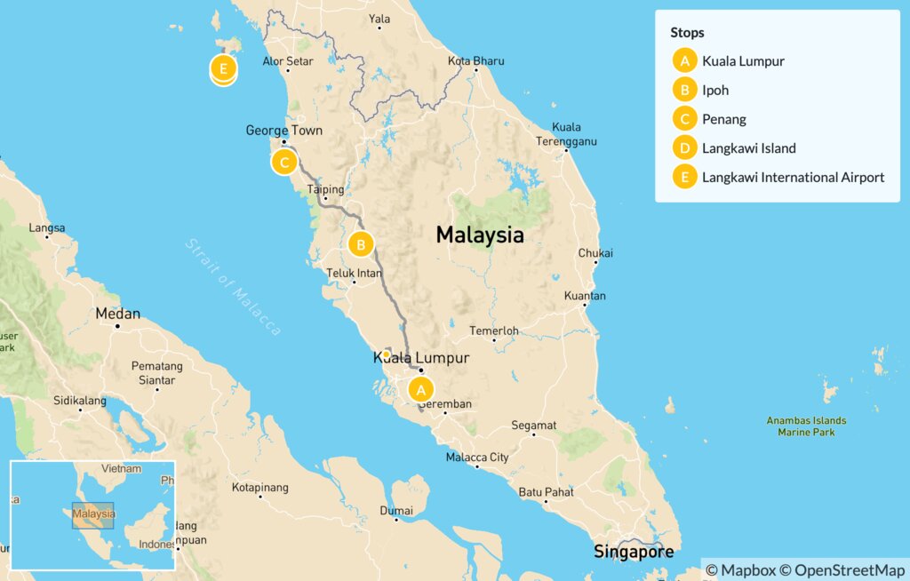 Map of Best of Peninsular Malaysia: Kuala Lumpur, Penang & Langkawi – 10 Days