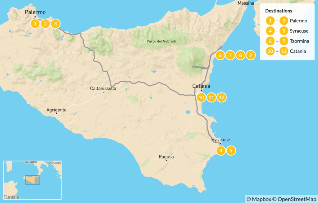 Map of Best of Sicily: Palermo, Syracuse, Taormina & Catania – 13 Days