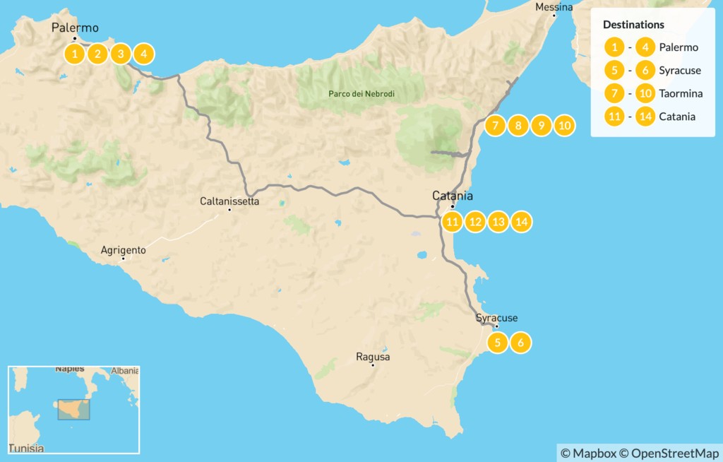 Map of Best of Sicily: Palermo, Syracuse, Taormina & Catania – 15 Days