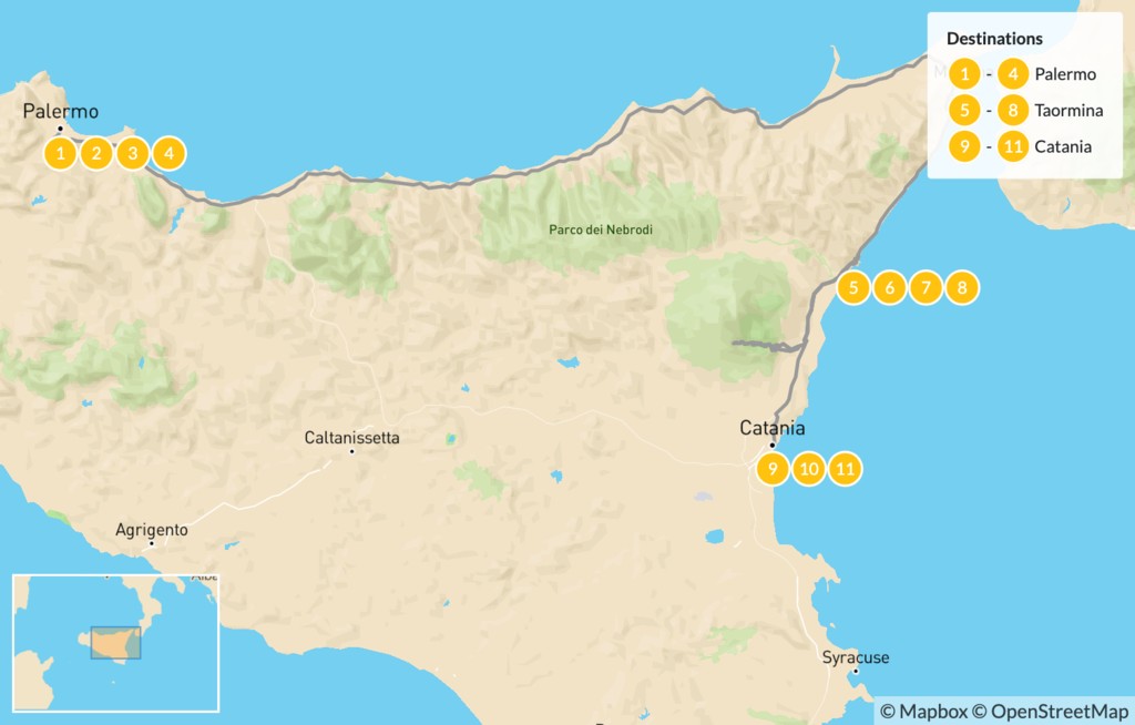 Map of Best of Sicily: Palermo, Taormina, Catania – 12 Days
