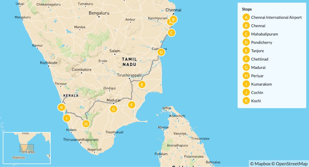 Map of Best of South India Tour from Chennai to Kochi – 13 Days