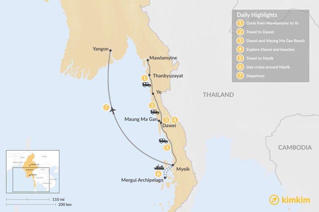 | Day 5 | Dawei – Myeik (142 miles/230 km.) | Myeik |