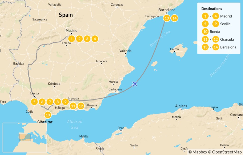 Map of Best of Spain Highlights Tour: Barcelona, Madrid, & Seville – 15 Days