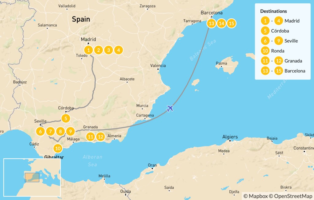 Map of Best of Spain Highlights Tour: Barcelona, Madrid & Seville – 16 Days