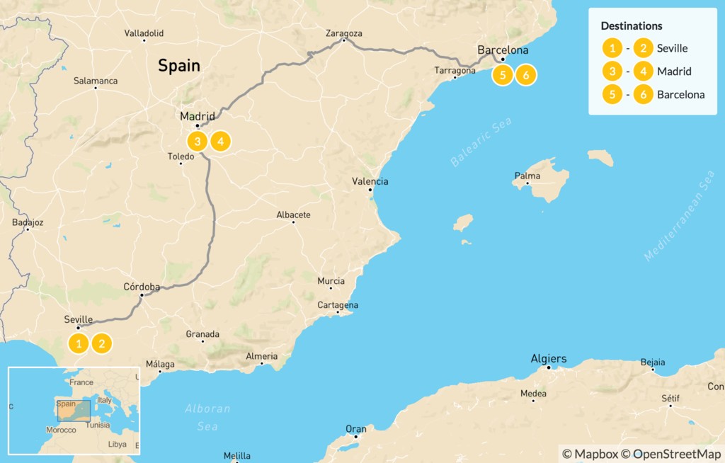 Map of Best of Spain Highlights Tour: Seville, Madrid & Barcelona – 7 Days