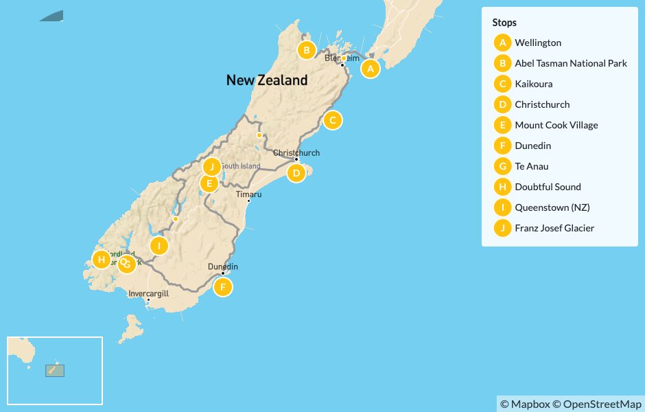 Explore the entire length of New Zealand’s South Island on this exciting 21-day road trip. Start in the tranquil coves of Abel Tasman National Park before following the coastline to Kaikoura for some whale watching. Continue through Christchurch and Dunedin as you make your way to the deep, cold waters of Fiordland National Park and the frozen peaks of the Southern Alps.