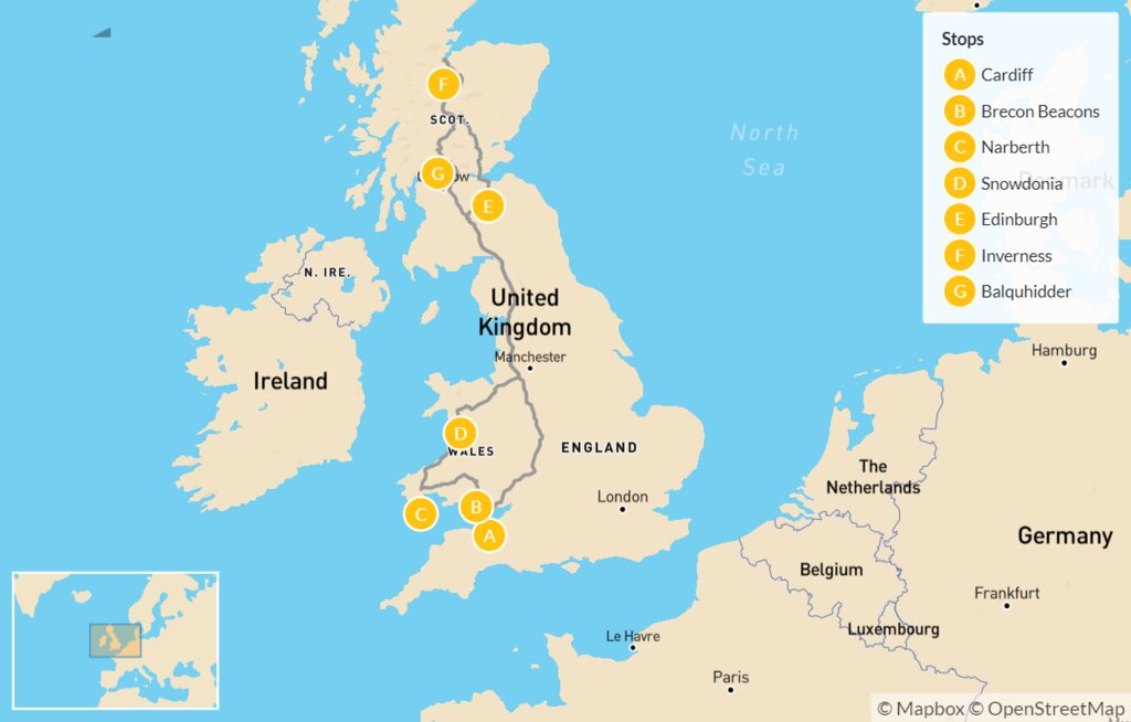 Map of Best of Wales & Scotland: Brecon Beacons, Snowdonia, Edinburgh, Inverness & More – 10 Days